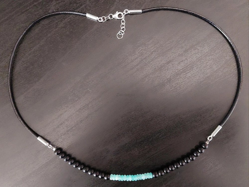 "BASE"Náhrdelník mozambický amazonit, onyx, kůže, Ag