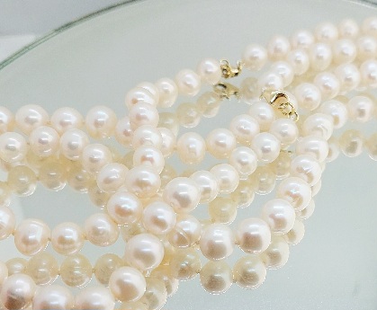 Krásné výběrové perly, které mají vysoký lesk, pravidelný kulatý tvar i velmi mírné znaky přírody v bílé barvě