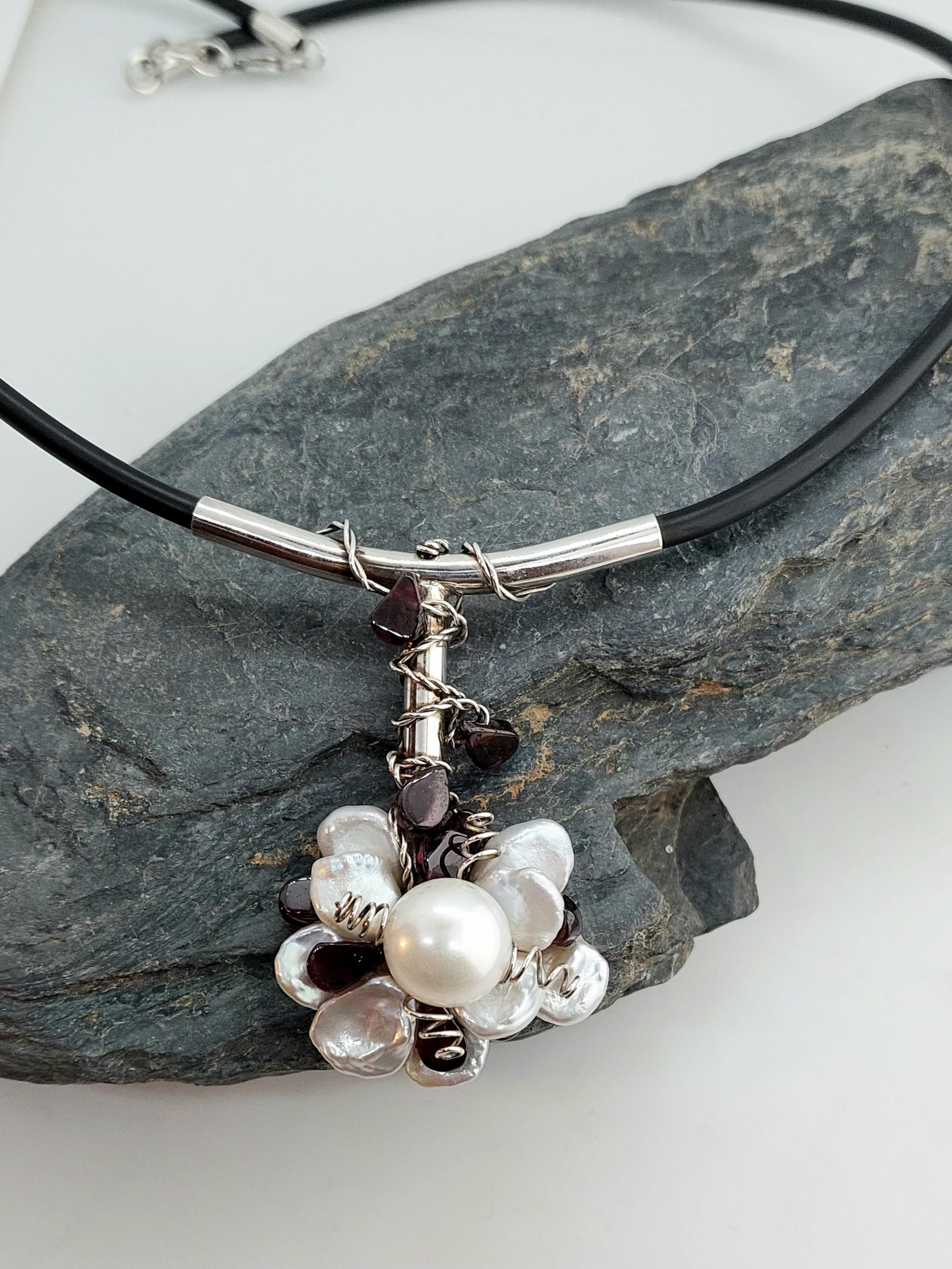Květ autorský náhrdelník perly a granát-stříbro