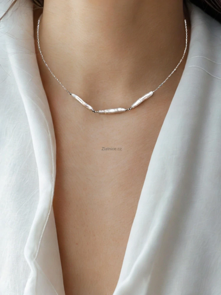 Objevte jemnou eleganci modelového minimalistického stříbrného náhrdelníku, který zaujme třemi krásnými větvičkovými sladkovodními perlami v pěkné kvalitě. Každá perla o délce přibližně 2 cm vytváří přirozený, lehce nepravidelný tvar, který dodává šperku jedinečný a nadčasový charakter.