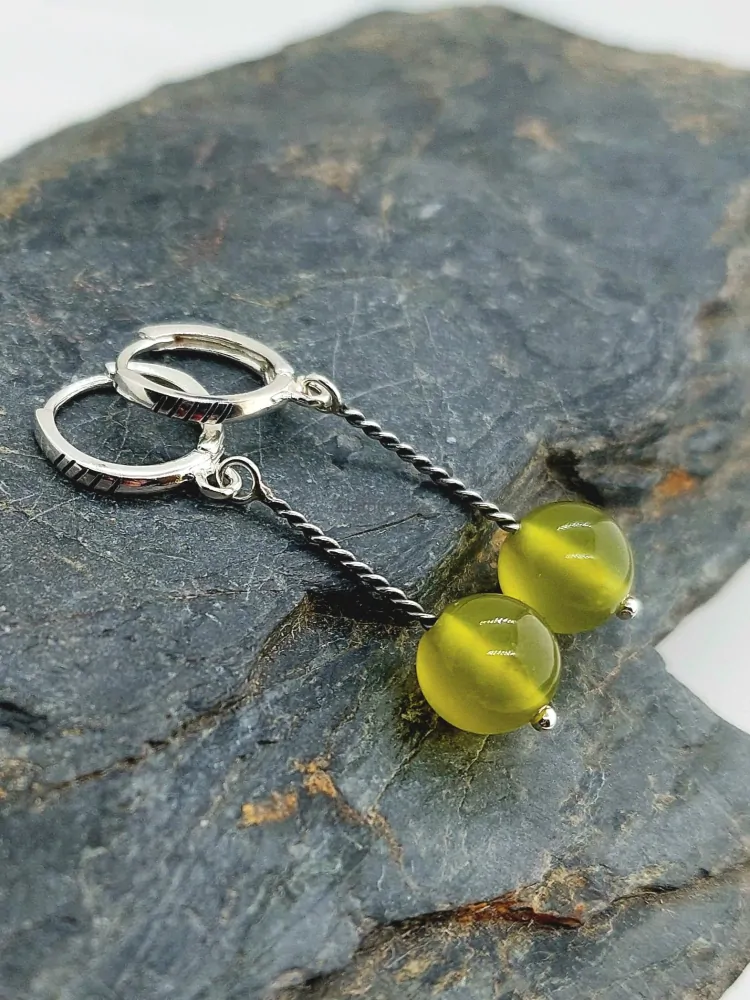 Modelové stříbrné visací náušnice z mé tvorby s olivíny s krásnou zelenou barvou - patinované