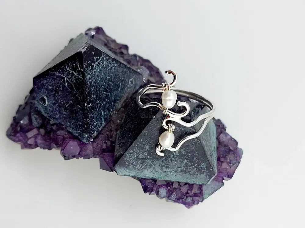 Něžný, ale výrazný prsten s říčními výběrovými perlami ve stříbře. Originální šperk na kterém bylo použito několik technik, včetně laserového letování.