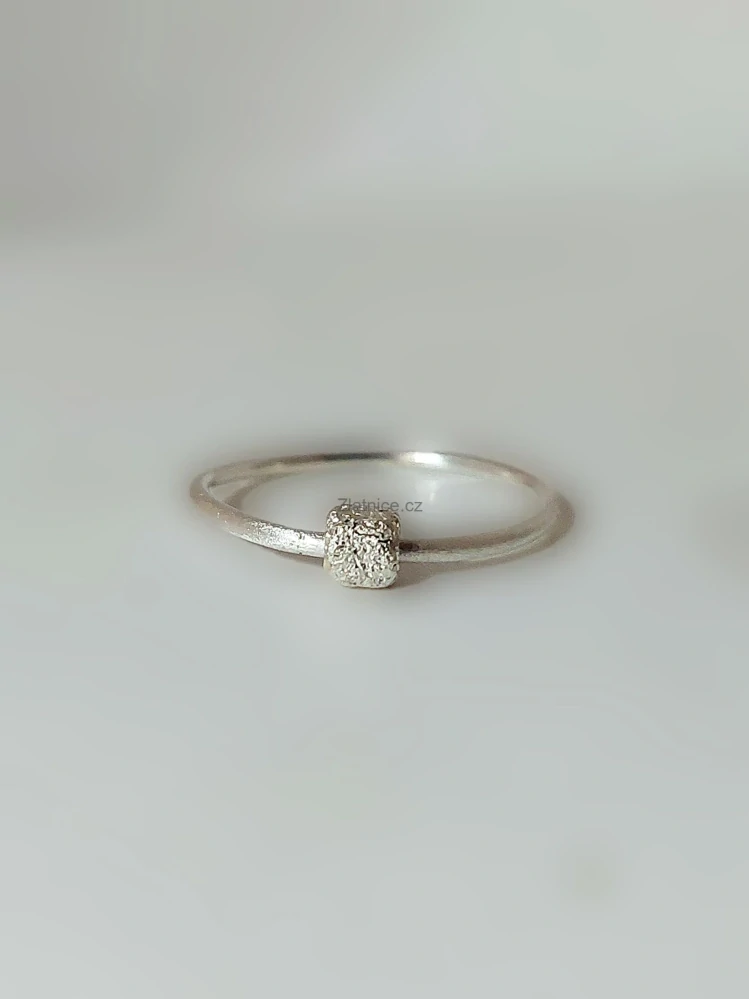 Modelový art prsten z mé tvorby tentokrát v elegantním designu velmi pěkně sedí na prstě. Minimalistický prsten s povrchovou úpravou a diamantem broušenou kostičkou.